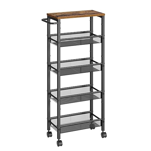 VASAGLE Rullvagn 5 nivåer, smal köksvagn, nischhylla på hjul, stål, handtag, små rum, 22 x 45,4 x 99,6 cm, kök, badrum, vardagsrum, arbetsrum, vintagebrun-svart LRC035B01