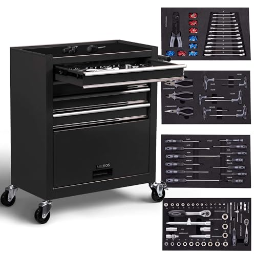 Arebos Verkstadsvagn 4 fack | 4 kullagerlådor inkl. 81 TLG. Verktyg | Rullvagn | Verktygsvagn utrustad | Halkfri matta | Interlock | 2 hjul med parkeringsbroms | svart