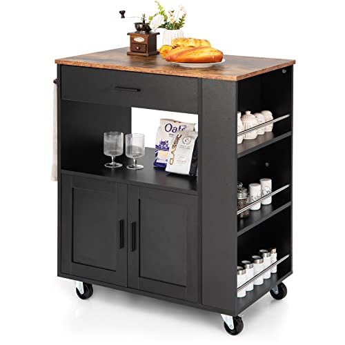GOPLUS Köksvagn, serveringsvagn med låda, tvådörrsskåp, kryddhylla i tre nivåer, vattentät, hjul med bromsar, rullvagn kökshylla för kök hotell restaurang (svart)