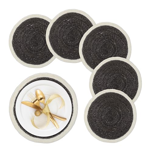 Relaxdays Bordsset, 6 delar, flätad, sjögräs, Ø 37 cm, rund bordstablett för matbord, bordsunderlägg, svart/gräddvit
