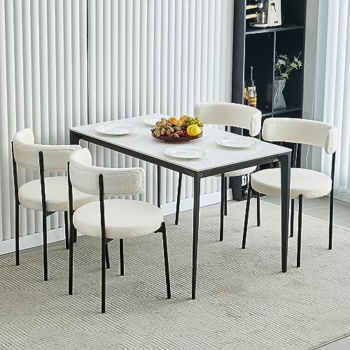 Generiska stolar matrumsstolar set om 4 köksstolar moderna, vardagsrumsstolar, fåtölj, stoppad stol, rund teddy-kudde, böjt ryggstöd, metallben, vit