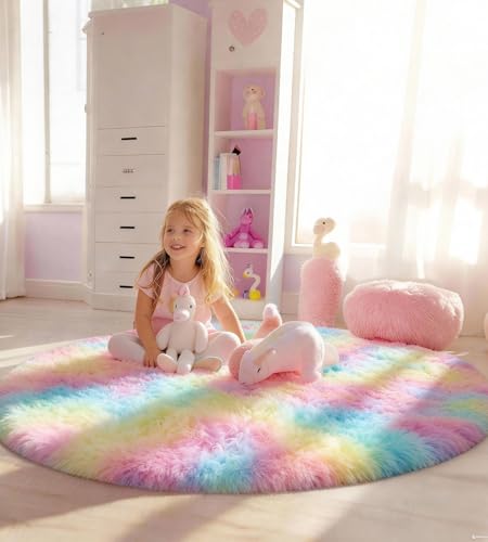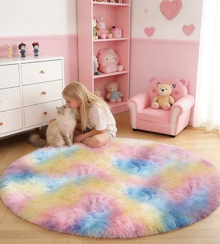Amdrebio Regnbågsfärgad, fluffig, rund matta, 122 m, söt, lurvig Kawaii-matta, för flickrum, enhörningsdekor, färgglad, pastell, studentrum, mjuk lekmatta för barnkammare