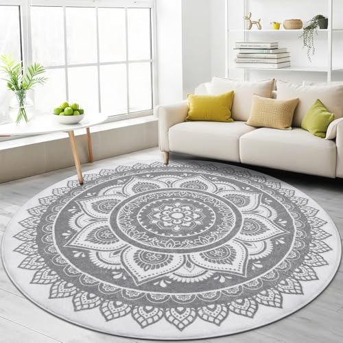 SHACOS Boho matta rund 120 cm, tvättbar, kort lugg, halkfri vardagsrumsmatta, rund fluffig matta för vardagsrum, sovrum, barnrum, kök, grå