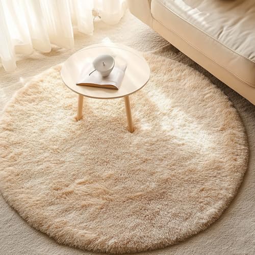 Beige rund matta för sovrum, fluffig cirkelmatta 10 cm x 10 cm för barnrum, lurvig matta för barnrum, luddig plyschmatta för sovsal, beige matta, söt rumsdekor för baby