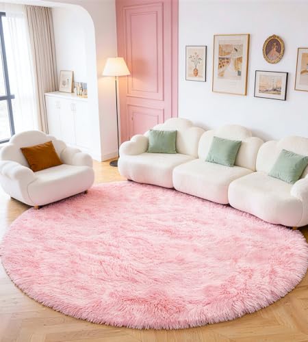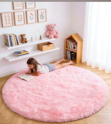 Amdrebio Rosa rund matta, 122 cm, mjuk, stor, fluffig, lurvig plyschmatta, för vardagsrum, flickrum, barnrum, barnkammare, studentrum, klassrum, tonåring, söt Barbie-matta