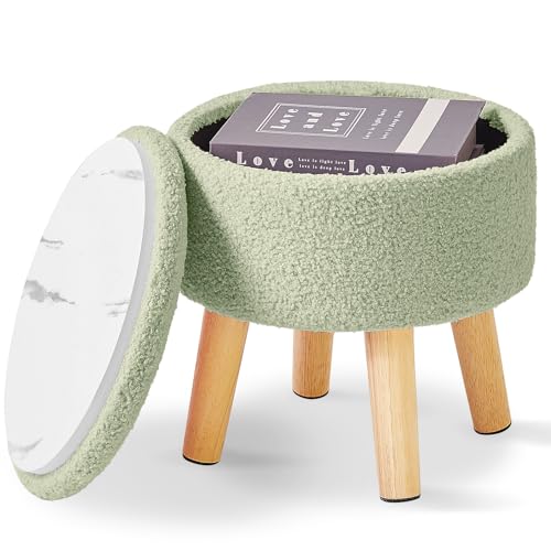IBUYKE 33 cm liten fotpall ottoman med förvaring, rund puff fotstöd med vadderat säte och träben, teddy sammet mini fotpall för vardagsrum soffa sovrum entré, grön WBD006GR