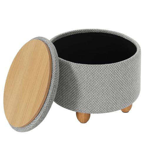 WOLTU Pall med förvaringsutrymme, rund sittpall, fotpall med lock, vadderad pall med massiva träben, linneöverdrag, 39 x 33 cm, ljusgrå, SH77hgr