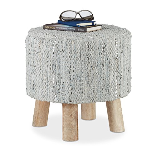 Relaxdays vintage retro fotpall handsydd, stoppad, ottoman med tyghölje, rund puff, massivt mango träben, H x Dia 44,5 x 42 cm