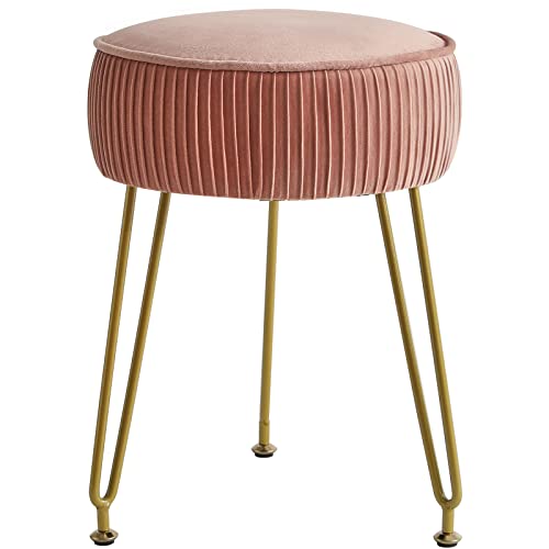 Fantash Sittpall, toalettbordspall i sammet, rund fotpall, vadderad ottoman med metallben för sminkbord, vardagsrum, sovrum (rosa)