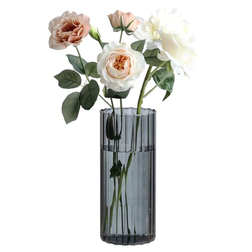 ComSaf Liten vas dekoration för bordsdekoration, modern blomvas glas, minivas tulpanset, glasvas cylinder rund stor, tulpanvas för tulpaner, pampasgräs, orkidéer, rosor, 20 cm hög, grå