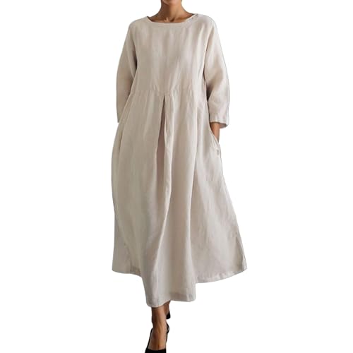 Linneklänningar för kvinnor UK damer lös passform sommar maxiklänning rund hals 3/4-ärm lång klänning med fickor hög midja bomull linne gunga, BEIgE, S