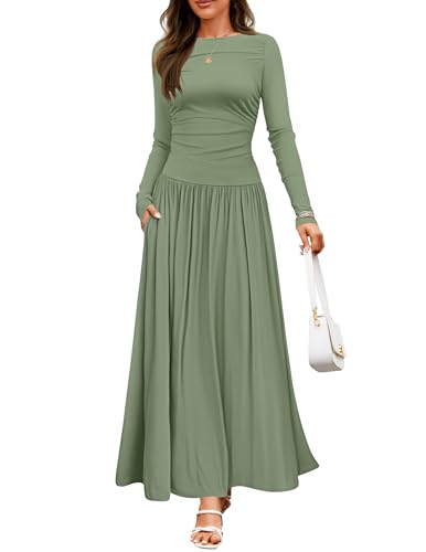 ZESICA Dam långärmad maxiklänning 2024 höst rund hals stickad vardaglig smal gunga veckade klänningar med fickor, Böngrön, M