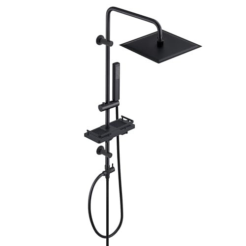 Görbach Regndusch, duschsystem med hylla, duschset i rostfritt stål utan armatur med fyrkantigt huvuddusch, rund duschstång, svart (20 x 20 cm)