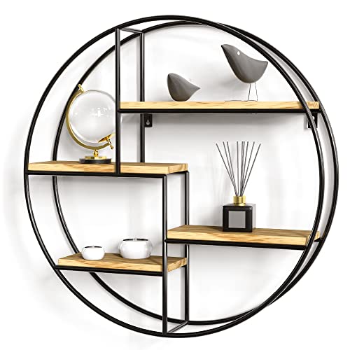 Gadgy Rund Vägghylla med 4 Hyllor i Trä och Metall - Dekorativ Svävande Hylla för Vardagsrum Sovrum eller Kontor - 42x10 cm
