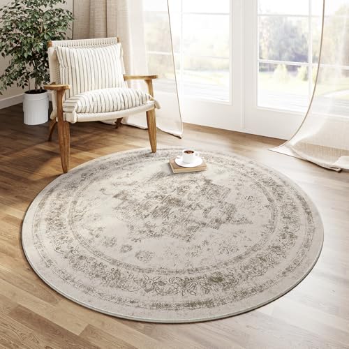 HUGEAR Vintage Rund Matta Taupe Runda Mattor 120cm Tvättbar Halkfri Golvmatta Sovrum Vardagsrum Kontor Barnrum Carpet Rug Mjuk Kort Lugg