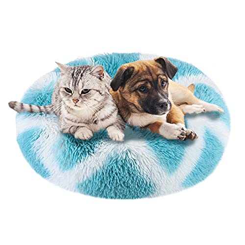 jiuzcare Kattsäng, 50 x 50 cm, husdjurssäng för små hundar och katter, rund munk, plysch, gosig säng, hundsäng, kattsäng, tvättbar, fluffig hundkudde, kattkudde, blå och vit, randig