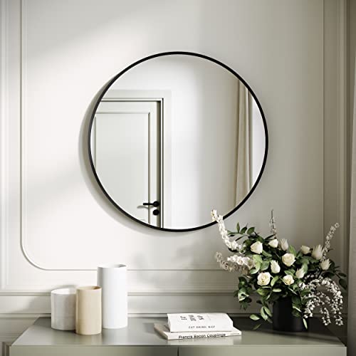 SONNI Rund väggspegel 60 cm, svart aluminiumram, väggmontering, sminkspegel med HD-glas, modern cirkelspegel för badrum, vardagsrum