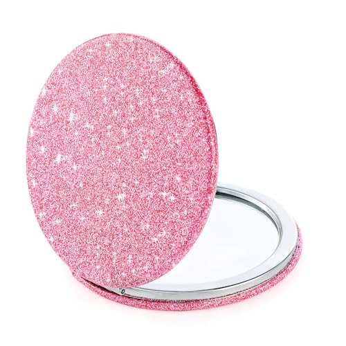 Andibro Liten kompakt spegel med glitter, vikbar sminkspegel med ficka, handhållen 2-sidig 1 x 2 x förstorande söt kosmetisk spegel, rund PU-läderspegel för kvinnor, flickor, resor (rosa)