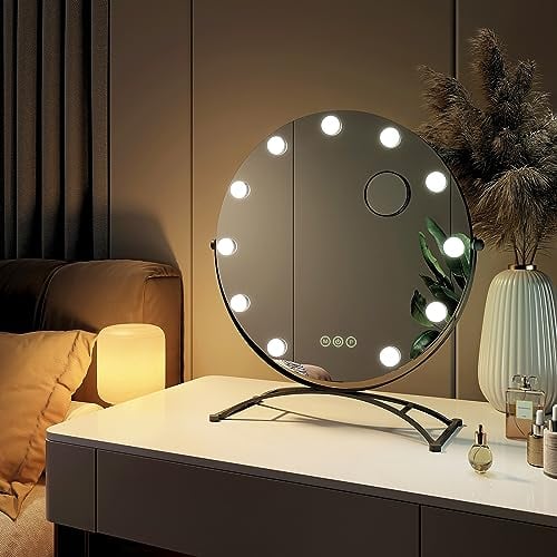 EMKE Rund Hollywood-sminkspegel, diameter 50 cm, svart ram, 7X förstoringsspegel med 11 LED-lampor, touch-brytare, 360° rotation, 3 000/4 000/6 500K