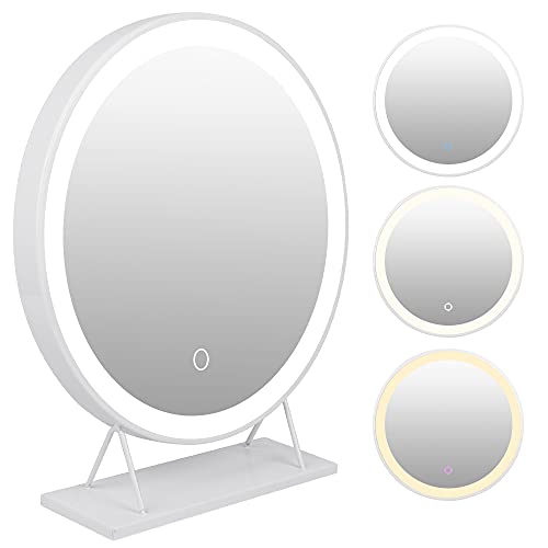 ROLOVE Sminkspegel med ljus, 45 cm LED-sminkspegel, upplyst sminkspegel med ljus, smart touch-kontroll, 3 färger, dimbar rund spegel, bords- och skrivbordsspegel, 360° rotation (vit)