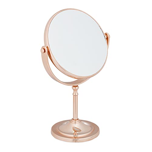 Relaxdays Sminkspegel, 2-vägs förstoring, dubbelsidig bordsspegel, 360° roterbar, rund, HBT 27,5 x 18 x 10,5 cm, koppar