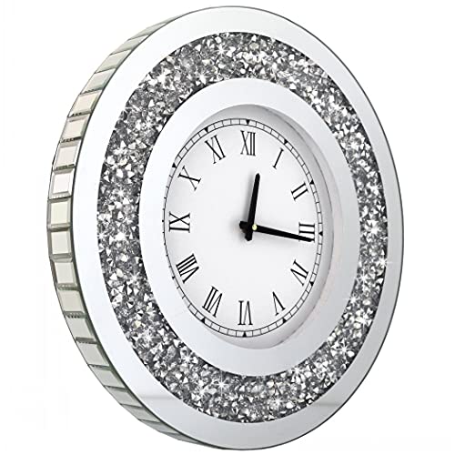 DMDFIRST Silver rund spegelklocka 50 x 50 cm kristall gnistrande bling kross diamant speglad stor väggklocka för väggdekoration silver glas spegel heminredning. AA-batteri ingår inte.