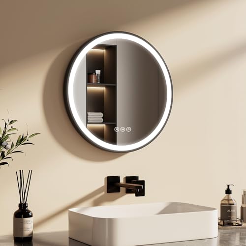 EMKE 50 cm rund badrumsspegel, rund spegel med pekbrytare och anti-dimfunktion, 3 ljusfärger, rund badrumsspegel svart ram och justerbar axelrem