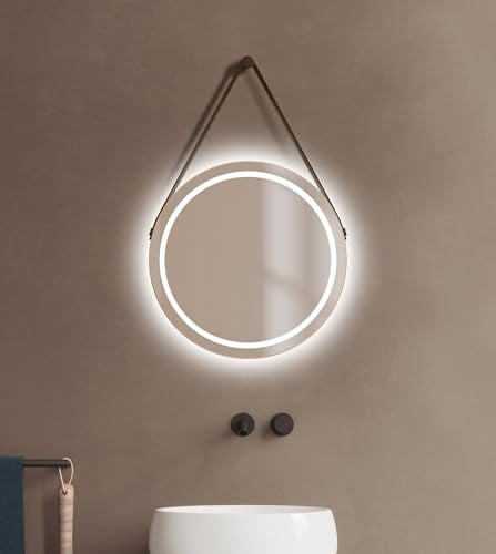 Talos Rund LED badrumsspegel CORVIA Shine i matt guld, Ø 50 cm - rund spegel med högkvalitativ läderrem - lämplig för fuktiga rum tack vare aluminiumram