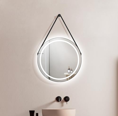 EMKE 50 cm rund badrumsspegel, rund spegel med beröringsbrytare och anti-dimfunktion, vitt ljus 6 500 K, rund badrumsspegel svart ram och justerbar axelrem