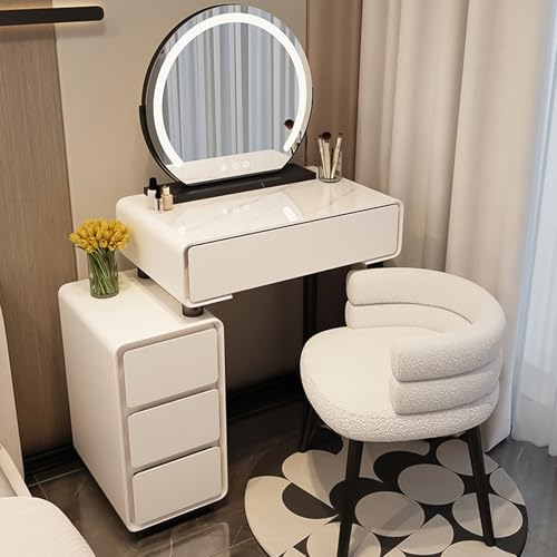 Litet Vitt/beige Sminkbord med Lådor, Toalettbord med Vadderad Stol, Sminkbyrå med Rund Spegel Justerbar LED-belysning, för Kvinnor Flicka Sovrum Familjens(White,60cm/23.6in)
