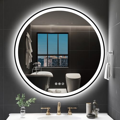 PESENXAN 70 cm rund spegel med svart ram och belysning – anti-dimma badrumsspegel med dimbar, 3 ljusfärger LED, energisparande, touchströmbrytare och minnesfunktion – svart