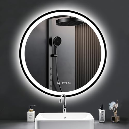 PESENXAN 70 cm rund LED-spegel med belysning och klocka – svart ram, anti-dimning, dimbar, 3 ljusfärger, touchbrytare, minnesfunktion, energisparande