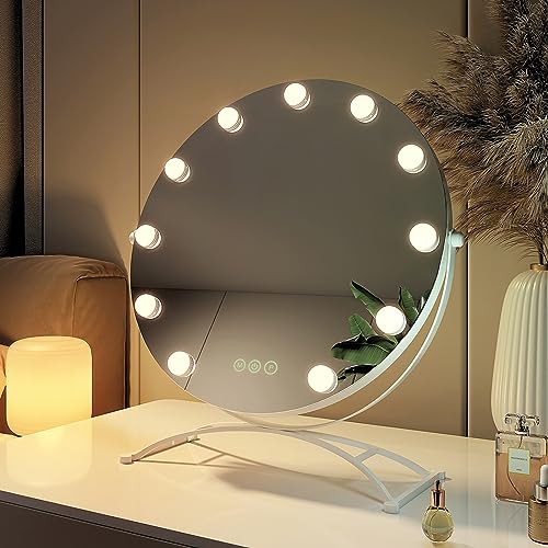 EMKE Hollywood-spegel, rund, 50 cm, dimbar, med 3 ljusfärger, sminkspegel med belysning, vridbar 360° med 11 LED-lampor, minnesfunktion, sminkspegel för sminkbord, vit