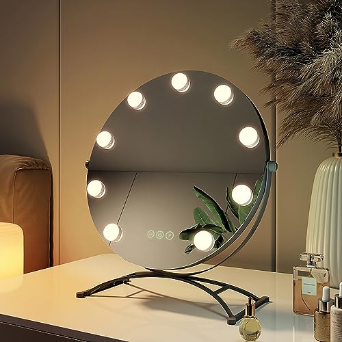 EMKE Hollywood-spegel, rund, 40 cm, dimbar, med 3 ljusfärger, sminkspegel med belysning, vridbar 360° med 9 LED-lampor, minnesfunktion, sminkspegel för sminkbord, svart