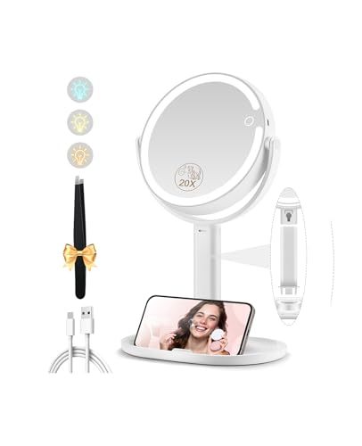 MOMOKUBA Sminkspegel med belysning, förstoringsspegel med ljus, 20 x, kosmetisk spegel med förstoring 8 tum, dubbelsidig 3 färger 64 led, sminkspegel med belysning, rund 360° vridbar
