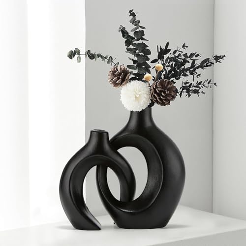 Anquephd Svart ihålig keramisk vas uppsättning av 2, unik rund modern vas för nordisk minimalistisk stil dekoration, donut boho estetisk vas för kaffe & köksbord, pampasgräs. Svart