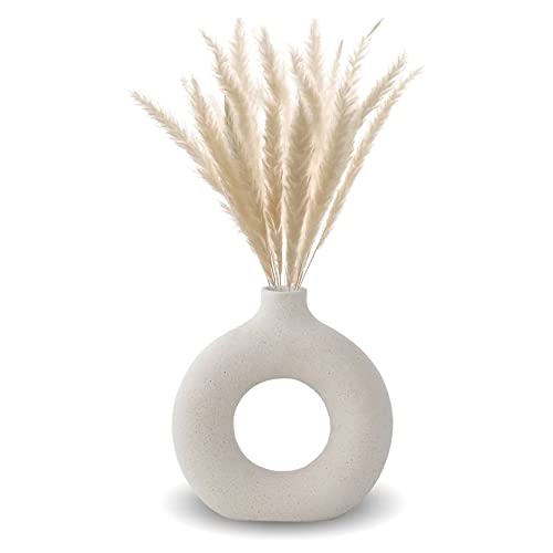 Anquephd Beige ihålig keramisk vas uppsättning av 2, unik rund modern vas för nordisk minimalistisk stil dekoration, donut boho estetisk vas för kaffe & köksbord, pampasgräs. (beige)