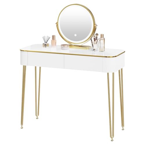 eSituro Sminkbord för kvinnor med justerbara LED-lampor i 3 nivåer, sminkstation med rund spegel och 2 lådor i massivt trä, vit guld, SDT0083