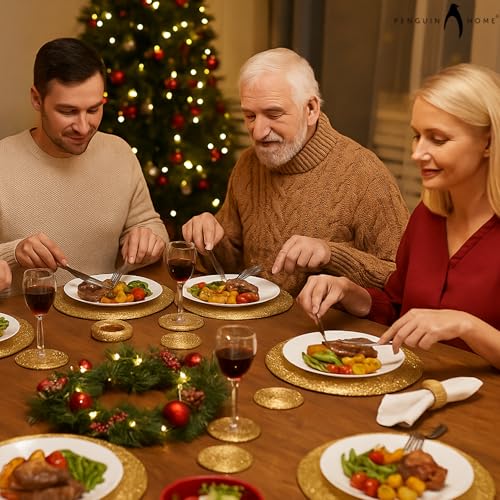 Penguin Home® Set med 18 glaspärlor bordstabletter, underlägg och servettringar – guldfärgade – runda bordstabletter – handgjorda av erfarna indiska hantverkare – 32 cm, 3551