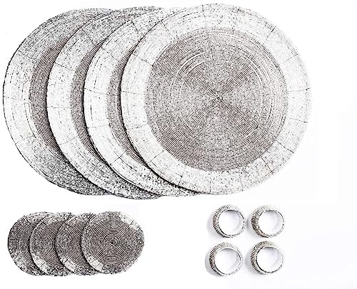 Penguin Home® Set med 12 glasunderlägg och servettringar i glaspärlor – antik silverfärg – runda bordstabletter – handgjorda av skickliga indiska hantverkare – diameter – 32 cm (13 tum)