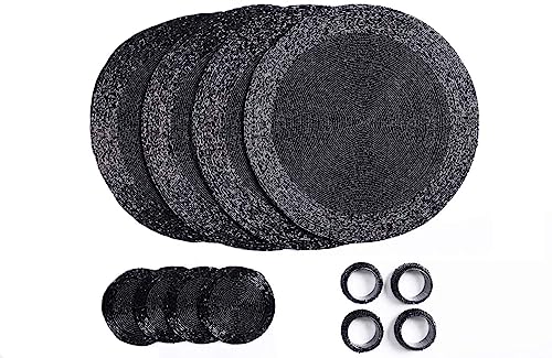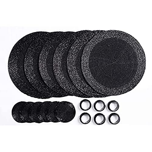 Penguin Home® Set med 12 glasunderlägg och servettringar i glaspärlor – svart färg – runda bordstabletter – handgjorda av skickliga indiska hantverkare – diameter – 32 cm (13 tum)