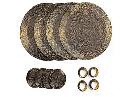 Penguin Home® Set med 12 glasunderlägg och servettringar i glaspärlor – antik guldfärg – runda bordstabletter – handgjorda av skickliga indiska hantverkare – diameter – 32 cm (13 tum)