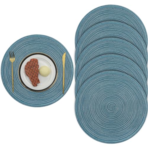 FunWheat runda flätade bordstabletter set med 6 bordsmattor för matbord vävda tvättbara halkfria bordsunderlägg 38 cm för sommaren (blå, 6 st)