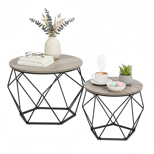 BOFENG Runda soffbord, set med 2 stapelbara sidobord med robust stålmetallram, vardagsrumsbord, soffbord för litet utrymme, naturlig ek