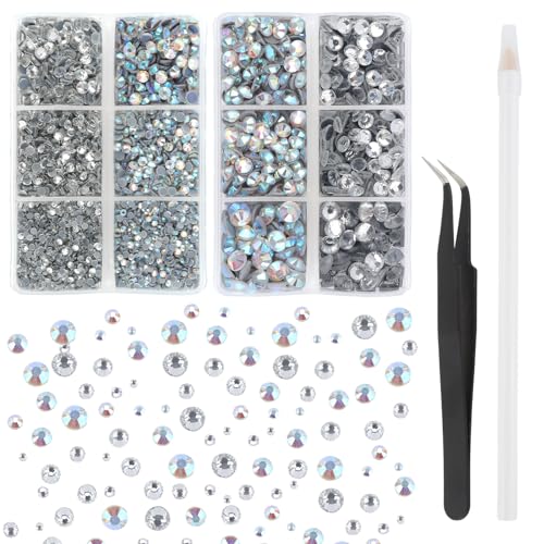 Hotfix-strasstenar, 12 storlekar, glittrande stenar, klara strasstenar, transparenta, runda, kristall, för kläder, konsthantverk, kit med blandade stenar och pincett
