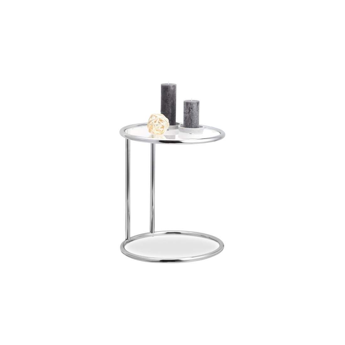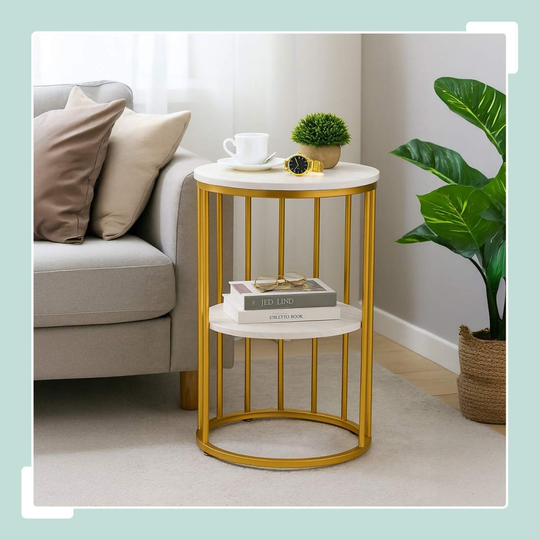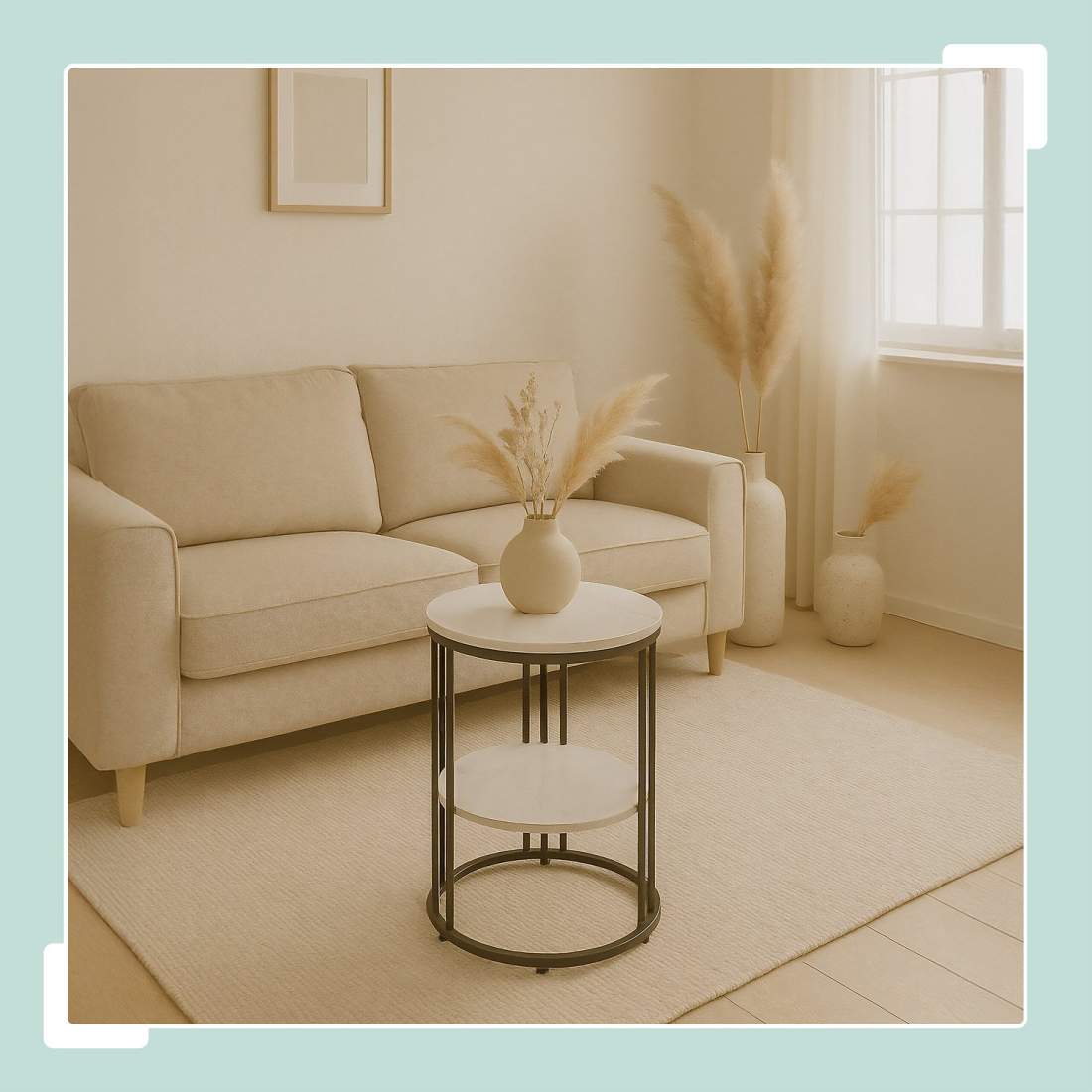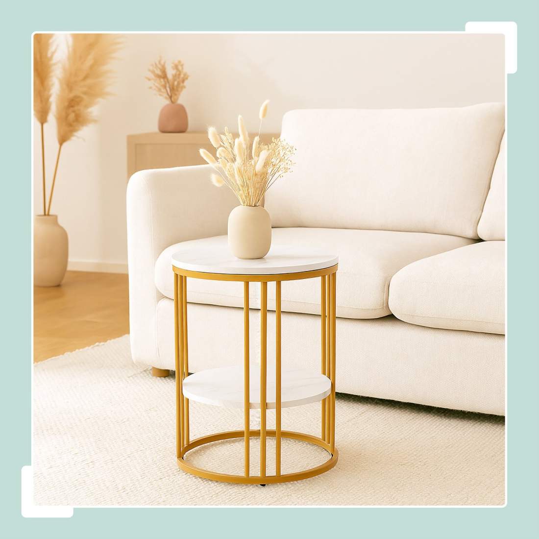 Runt sidobord med skiva i marmorimitation och soffbord med justerbara fötter