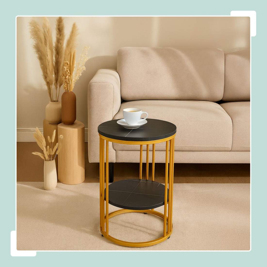 Runt sidobord med öppen hylla & Metallram 2-vånings Accent Bord Soffbord Valnöt
