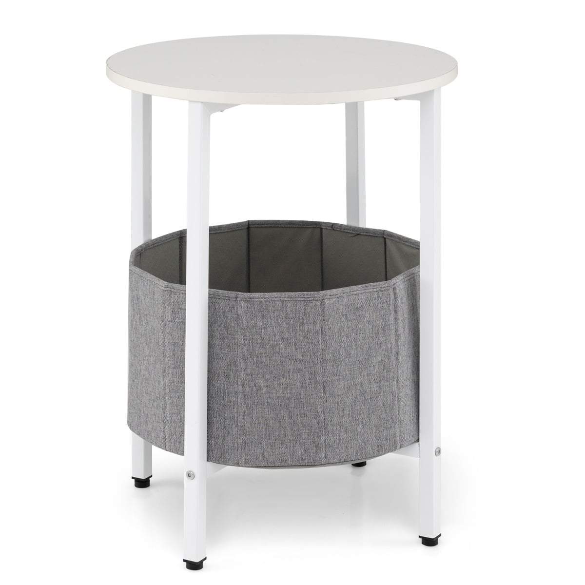 Runt sidobord med förvaringskorg – Litet, modernt, vitt