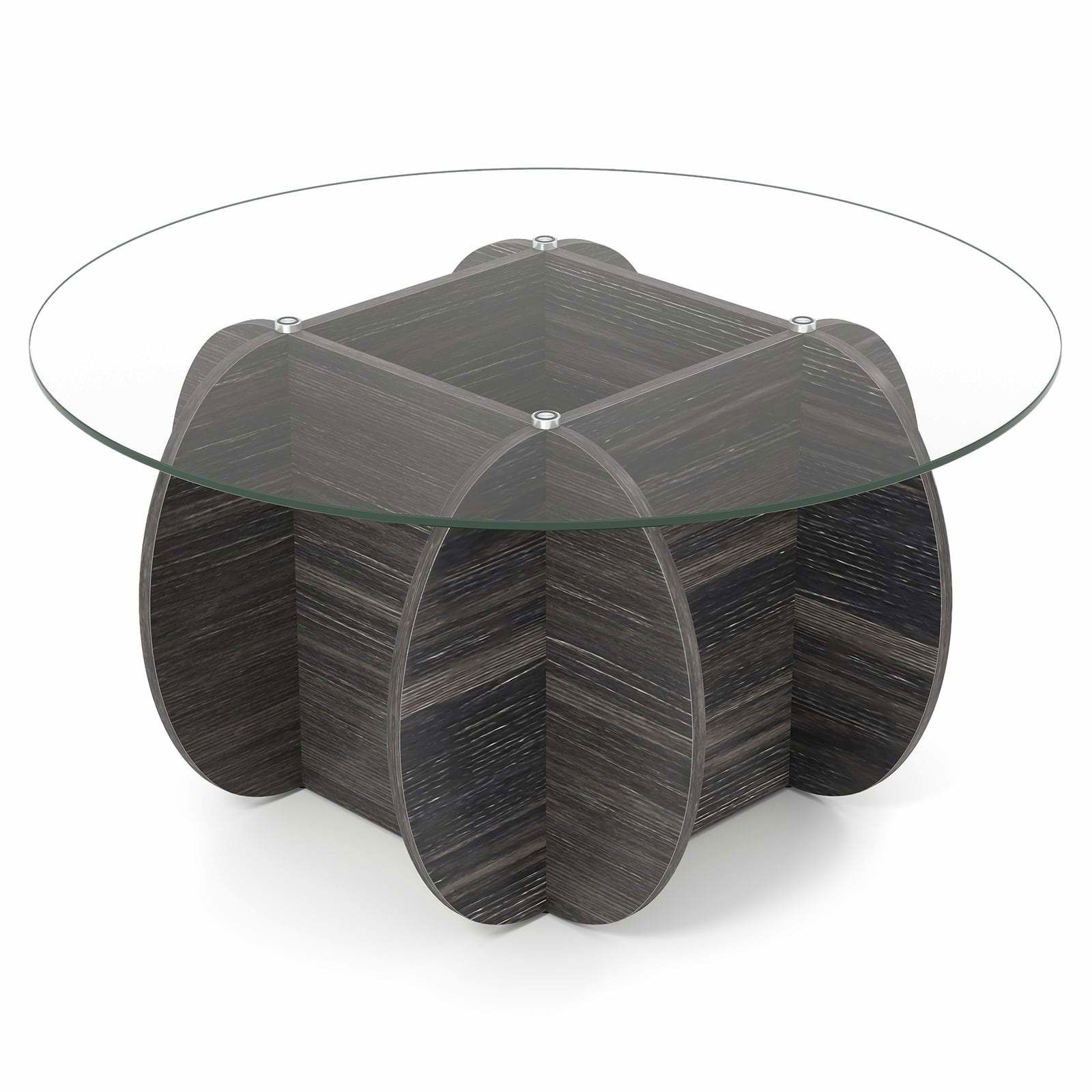 Runt soffbord – härdat glas och trä, dold förvaring