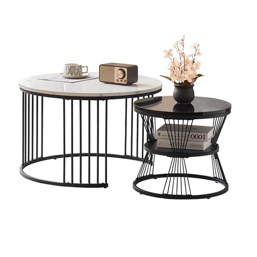 HAINEW Modernt runt soffbord set om 2 runda bordsset vardagsrumsbord med metallram och marmor fanér sidobord soffbord för vardagsrum (svart ram + vit bordsskiva), HNDEWF296678